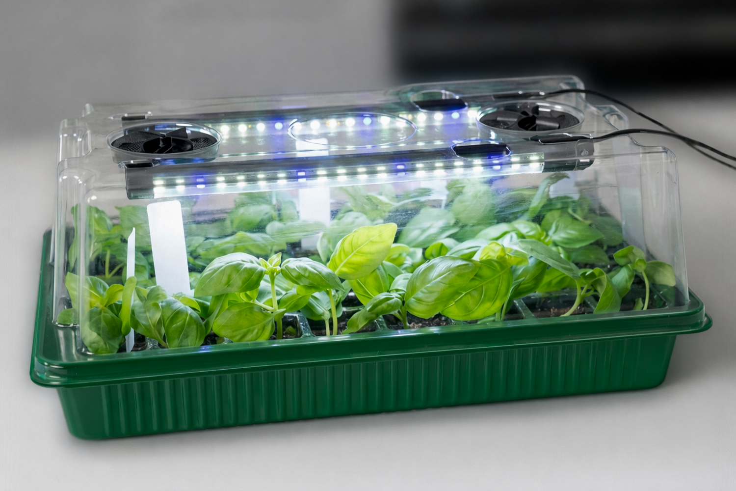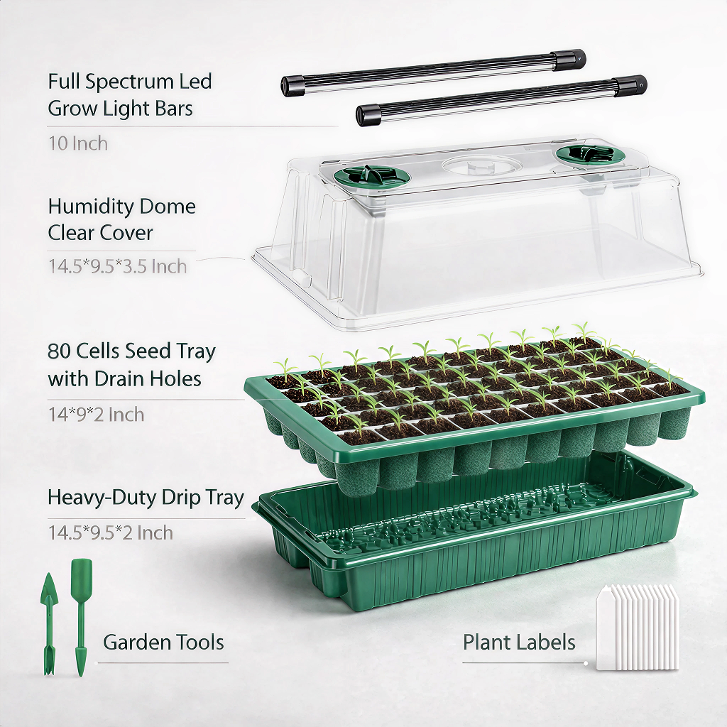 BPA-free plastic trays, clear humidity dome, and full-spectrum LED light bars. Built to last multiple growing seasons.
